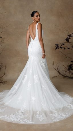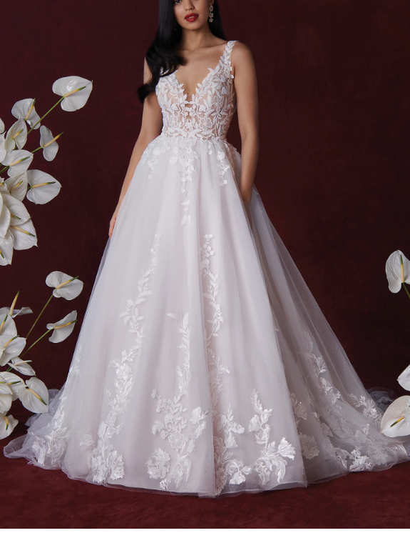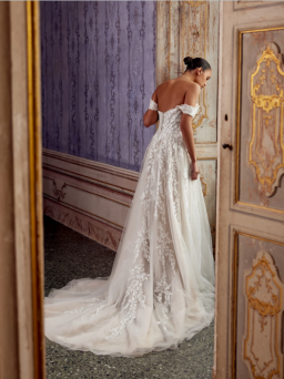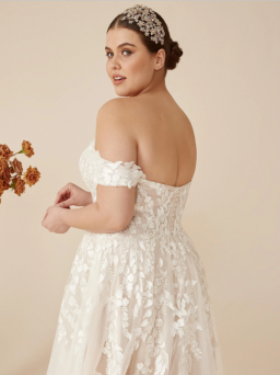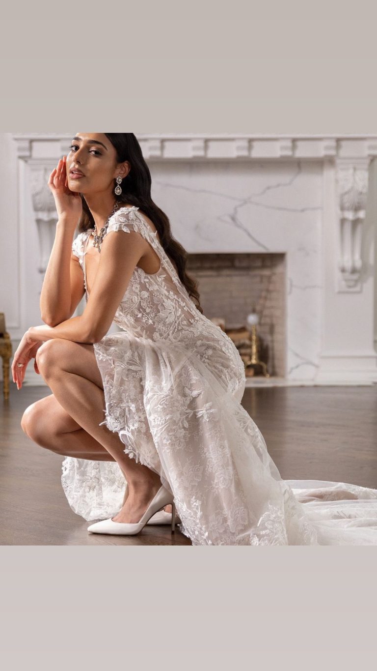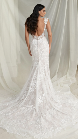Intricately placed lace gives off the most romantic vibes with this fit and flare wedding dress. Featuring lovely feminine
