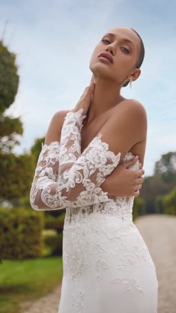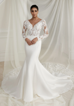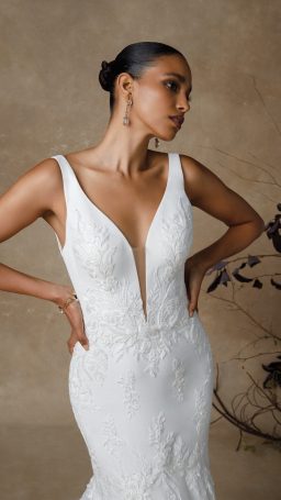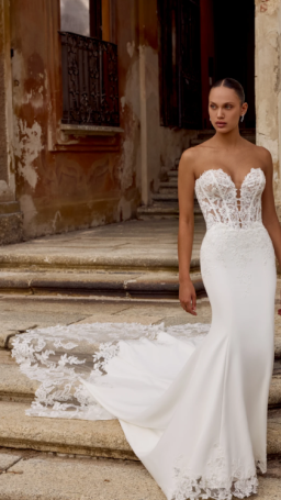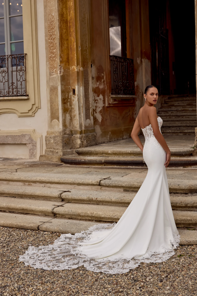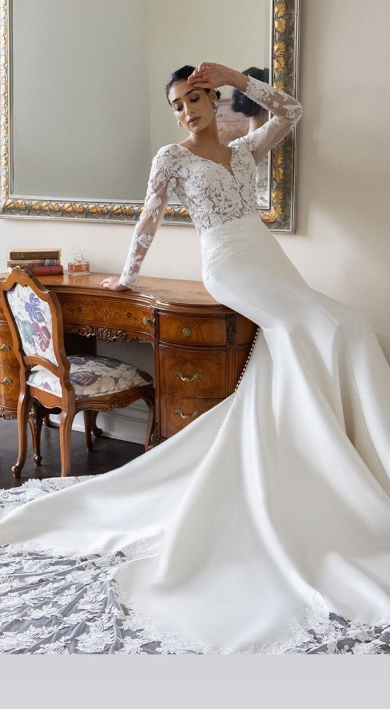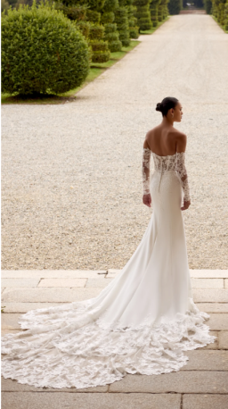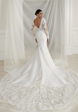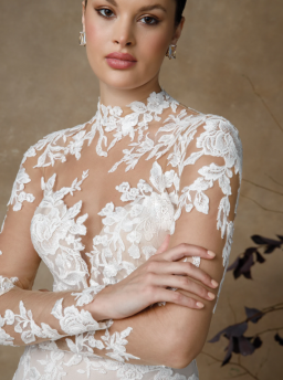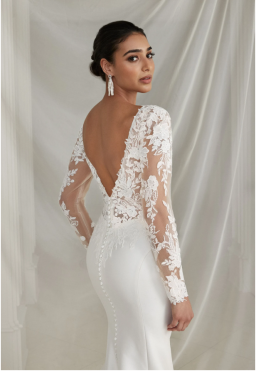 Think seductive sillouette with luxurios crepe fabric hugging your body in all of the right places, accompanied with vintage sequined lace this bridal gown ooses ramance & elegance!