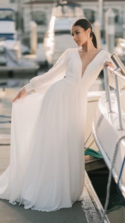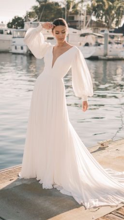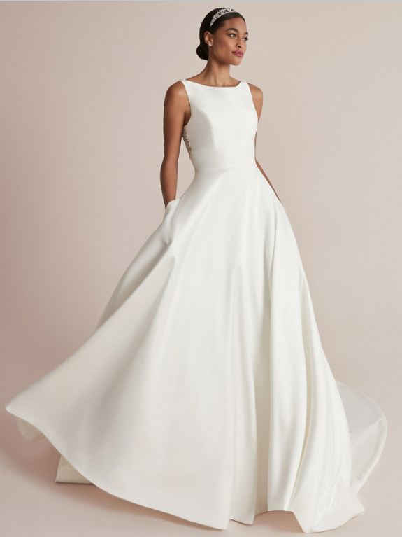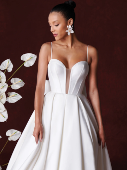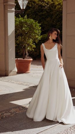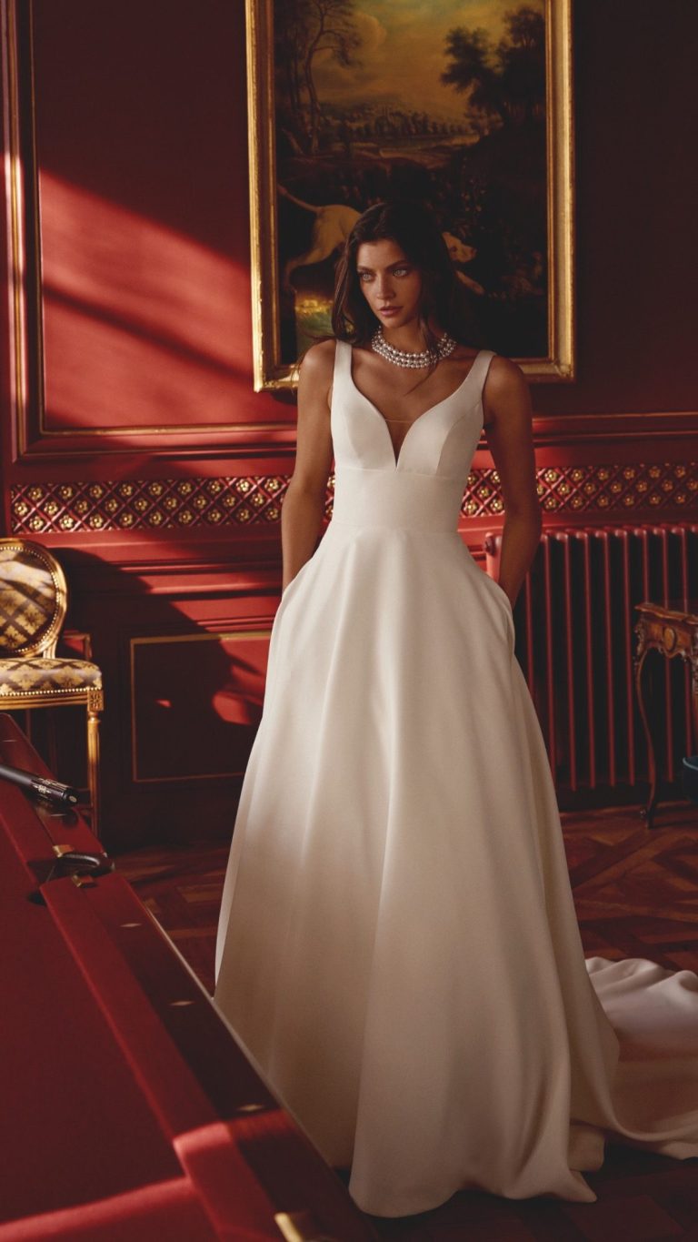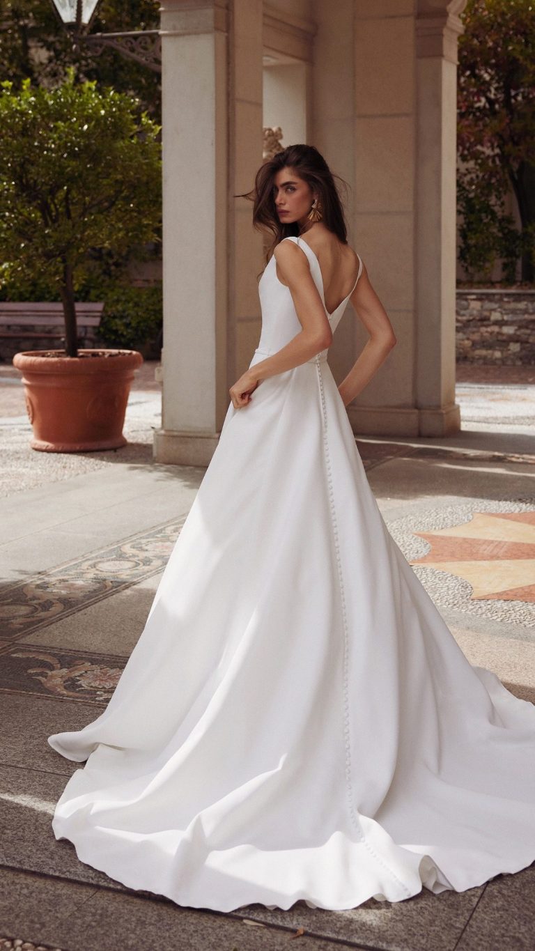 A clean and crisp beauty, this A-line wedding dress is a fashionable take on the minimalistic trend.