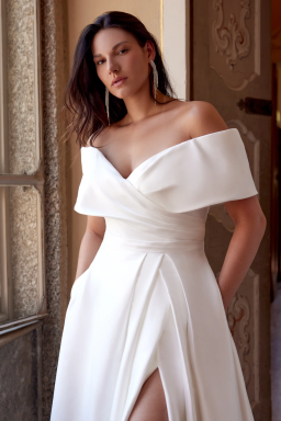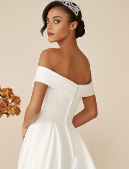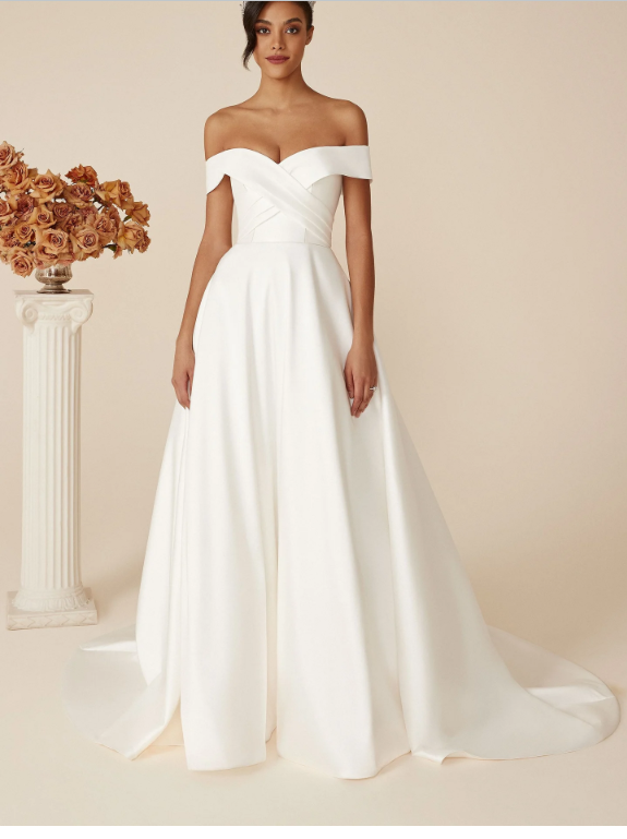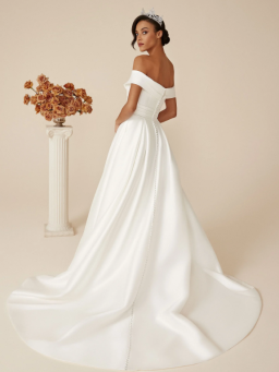 Fit for a ballroom wedding, this regal stretch Mikado A-line wedding dress features a carefully pleated bodice and a flattering cuffed off the shoulder neckline.