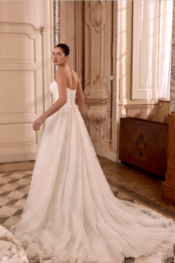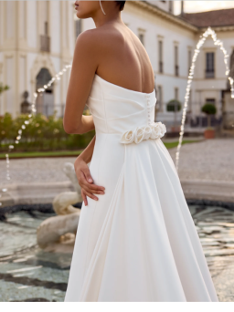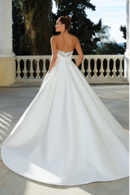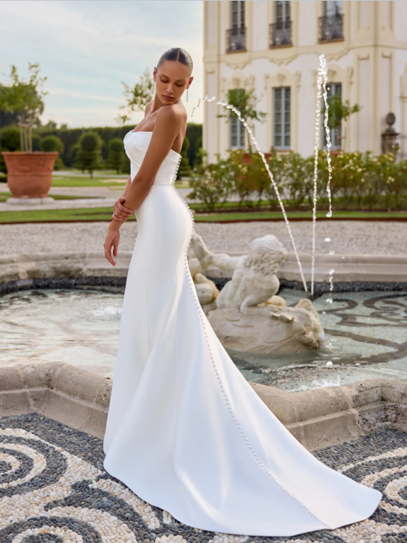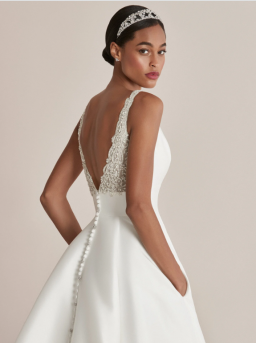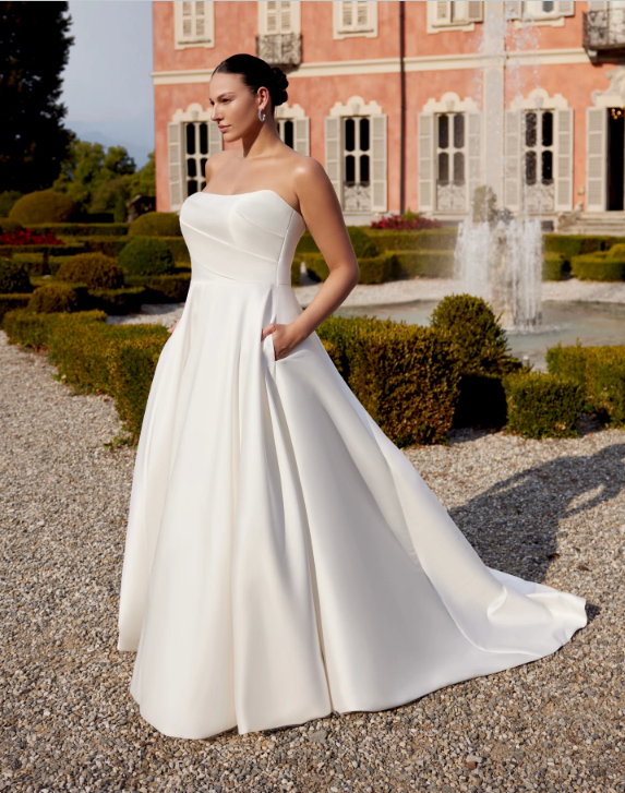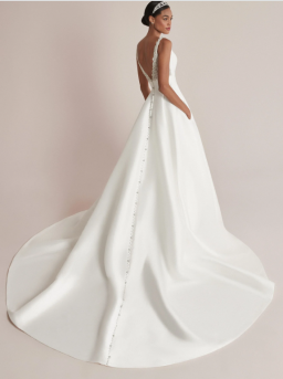 The waistline is accentuated with a cummerbund seaming that flatters every shape and size. A modern pocket detail adds to the full skirtand is finished with buttons trickling down the chapel length train.