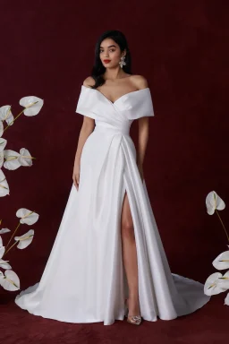 A-Line Plus Size Wedding Dress with Off The Shoulder Cuff and Skirt Slit 88354