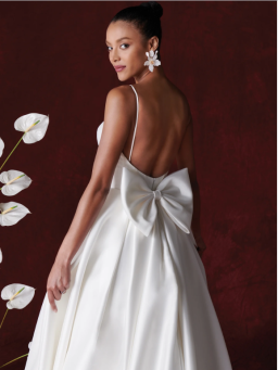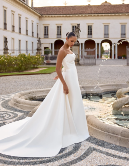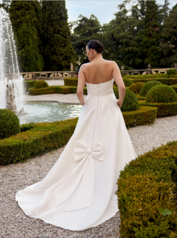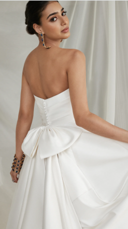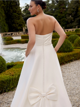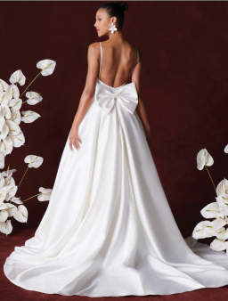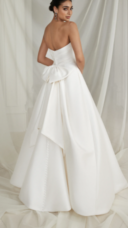 This luxurious Mikado A-line features a stylized strapless neckline that is accented with asymmetric pleating. A matching bow on the train adds a unique design detail that loops onto the natural