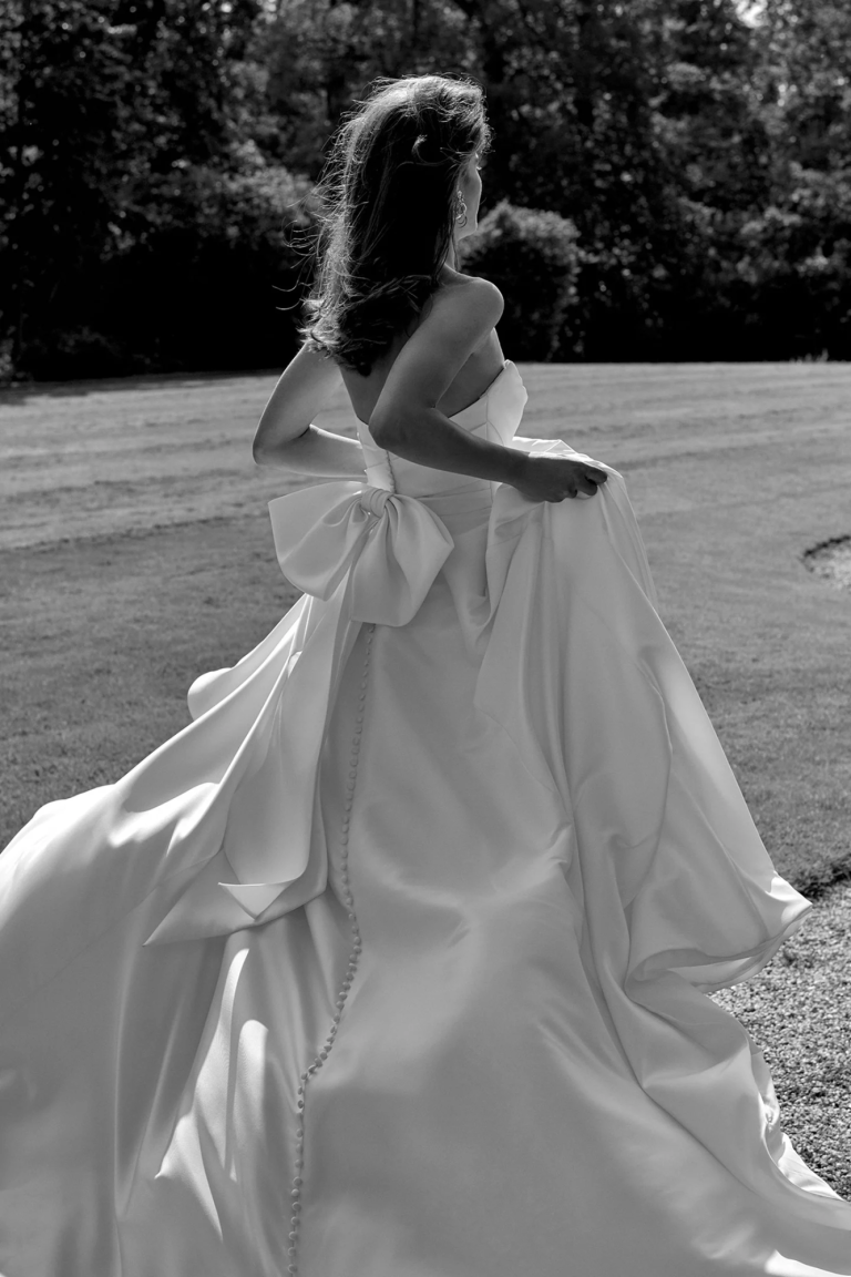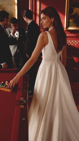 The style is finished with pockets and Mikado covered buttons to the end of the chapel length train.
