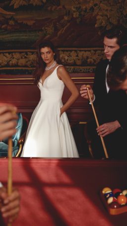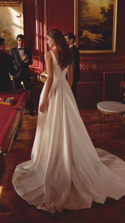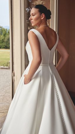 Less is more with this clean A-line wedding dress. Designed in a soft luxe satin, the classic gown has a plunging V- neckline complemented with a matching V-back.