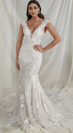 beaded appliqués, an allover Chantilly lace throughout the gown adds soft dimension. The sheer bodice is given a subtle plunge at the V-neckline that is perfectly accented with cap sleeves and a low scoop back. The fitted silhouette, paired with a stretchy jersey lining, will hug and contour your curves.