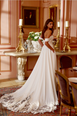 Train length: ChapelSweetheart neckline with detachable off the